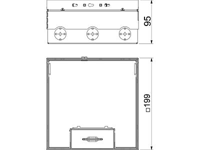 Čtvercový přístrojový nástavec pro použití v dutých podlahách se suchou údržbou a podlahách z mazaniny v interiéru. Vestavné pouzdro s předlisovanými přívodními otvory pro trubky (M25). Prázdné pouzdro až pro 2× univerzální nosič UT3 až pro 6× instalační přístroj Modul 45®. Vrchní díl nastavitelný pomocí 4 nivelačních podpěr na horní hranu podlahové krytiny. Minimální montážní hloubka je 95 mm, nivelovaná plocha + 30 mm.