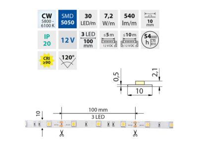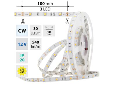 LED pásek SMD5050, studená bílá (6000K), 7,2W, 30LED, 540lm/m, segment 100mm, 3LED/segment, IP20, DC 12V, životnost 54000h, šíře 10mm, bílý PCB pásek, max. délka pásku při jednostranném zapojení: 5m, opatřen samolepící páskou 3M.
