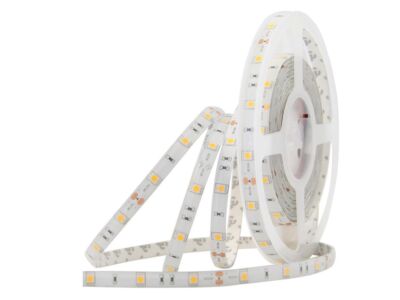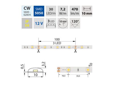 LED pásek SMD5050, studená bílá (6000K), 7,2W, 30LED, 470lm/m, segment 100mm, 3LED/segment, IP54, DC 12V, životnost 54000h, šíře 10mm, bílý PCB pásek, max. délka pásku při jednostranném zapojení: 5m, opatřen samolepící páskou 3M.