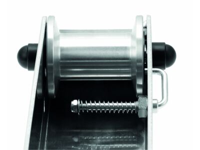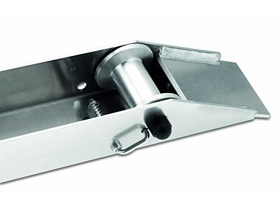 Hliníková kolejnice Katimex® s nosností až 300 kg, pro kabelové bubny libovolné šířky, s rolovací rampou a protiskluzovými gumovými patkami, variabilní rozteč podpěrných válečků (250 mm, 330 mm, 410 mm). S hliníkovými válečky a ručním zámkem bubnu (odvíjecí brzda) 1 pár.