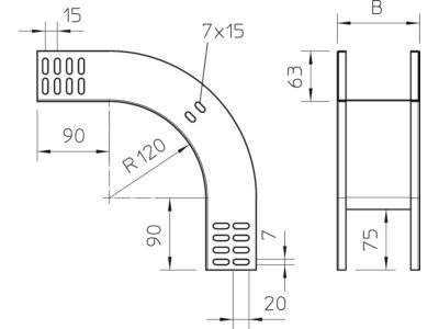 Svislý oblouk 90° v klesajícím provedení pro všechny typy kabelových žlabů s výškou bočnice 60 mm.