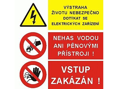 Tabulka samolepící "Výstraha životu nebezpečno dotýkat se el. zařízení/Nehas vodou ani pěnovými přístroji/Vstup zakázán!" velikost 21x21