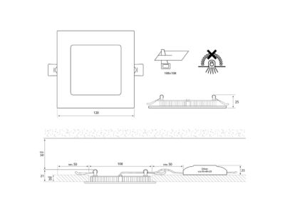 LED podhledové svítidlo 9W bílé, 230V, IP20, 2700K - teplá bílá, světelný tok 630lm, vyzařovací úhel 120°, CRI 80, životnost 50.000h, rozměry 120x120x25mm, materiál hliník/plast, nestmívatelné, PF>0,8