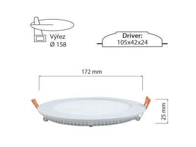LED podhledové svítidlo 15W bílé, 230V, IP20, 4000K - neutrální bílá, světelný tok 1150lm, vyzařovací úhel 120°, CRI 80, životnost 50.000h, rozměry ø172x25mm, materiál hliník/plast, nestmívatelné, PF>0,9