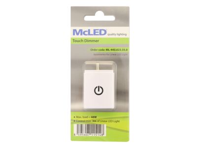 Dotykový stmívač k McLED LED lineárnímu svítidlu. Rozměry: 33x45x9,3mm. IP40. Krátký stisk zapne/vypne, dlouhý stisk snižuje/zvyšuje jas. Maximální zátěž 48W.