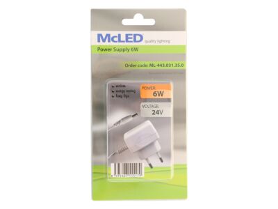 Napěťový zdroj pro McLED LED lineární svítidlo, výkon 6W. Zdroj je opatřen konektorem ke snadnému připojení ke svítidlu. Rozměry: 46x26x34mm, hmotnost: 0,096kg. Barva: bílá. Pro připojení do zásuvky. Vstup: 100-240 V AC, výstup DC 24V/0,25A. Délka kabelu je 1,5 m.