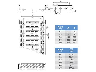 Embosovaný kabelový žlab s integrovanou spojkou; Funkční délka žlabů je 1950 mm