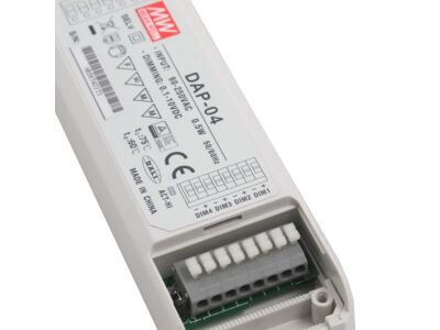 Převodník DALI signálu na PWM signál 1 - 10 V. Mean Well, typ DAP-04. Možnost touch-dim stmívání. Zapojujte tak, aby úbytek napětí mezi převodníkem a svítidlem nepřekročil 0,5V (viz. manuál), max. vzdálenost od tlačítka: 20 metrů. Synchronně dokáže řídit max. 80 svítidel. Rozměry: 165x46x23mm.