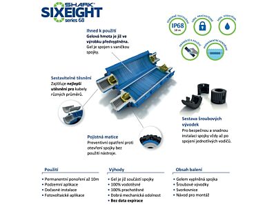Spojky jsou určeny pro jedno i více žilové kabely s plastovou/pryžovou izolací jako např.: CYKY, 1-CYKY a další. Kabelová gelová spojka SHARK IP68 je určena pro spojení přímé např. spojení kabelu pod vodou, spojení kabelu pod zemí, spojení kabelu na vzduchu, spojení v kabelových kanálech a nebo se dá použít jako dočasná instalace. Dostupné jsou 3 rozměrové varianty pro průřezy vodičů od 2,5 mm2 až 50 mm2. Gelový systém izolace je rychlejší oproti zalévacím pryskyřicím (nemusí zrát). Není potřeba žádné speciální nářadí - vše je součástí balení. Možnost opětovného přístupu - spoj lze jednoduše demontovat. Široká teplotní použitelnost -20 °C až 90 °C a odolnost proti UV záření. Výrobek není chemicky nebezpečný a je šetrný k životnímu prostředí. Další výhodou je neomezená doba skladovatelnosti - bez data expirace (nemusíte se bát, že se cokoliv s gelovou spojkou během týdnů skladování stane - bude vždy připravena k použití). Součástí balení je samotná spojka s gelovou výplní, pojistné matice (vývodky), svorka - dle typu, montážní návod.