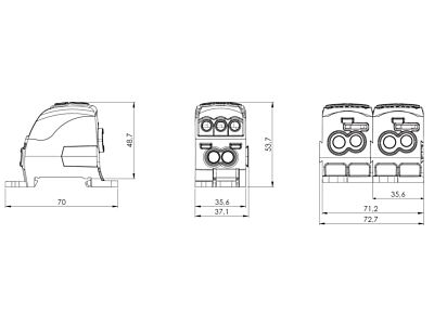 Blok pro rozdělení fází PDB 210 (dříve značeno PVB 125), 1pólový, pro CU vodiče, jmenovitý proud 210A, jmenovité napětí 690V, barva šedá / průhledné víko, montáž na DIN lištu / PANEL, krytí IP20, vstup 1x35mm2, výstup 2x25mm2, 4x16mm2.