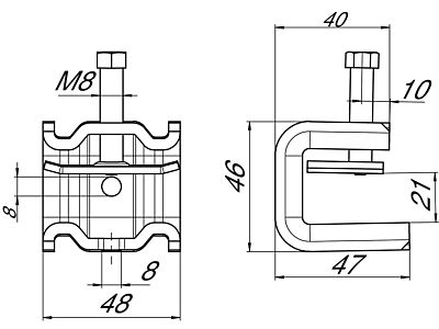 Tento druh nosníkové svorky se nasouvá na nosník a k nosníku nebo ploché oceli se upevňuje prostřednictvím přítlačné opěrky a šroubu (M8). Šroub se šestihrannou hlavou má velikost 10 mm. V těle příchytky se mimoto nacházejí dva další závity M8 například k upevnění závitových tyčí.