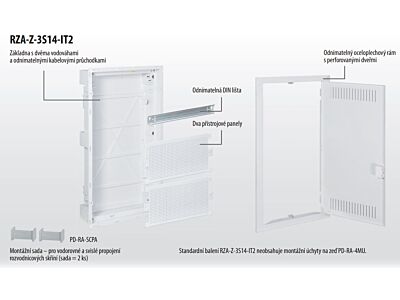 pro zapuštěnou montáž neprůhledné plechové dveře, počet řad 1, počet modulů v řadě 14, krytí IP30, barva bílá, materiál : ocel-plast, 2x přístrojový panel, 1x spojovací sada, bez čelního krytu