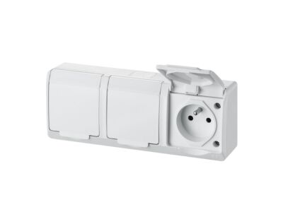 GALATEA 5323-02 IP44 Zásuvka 3x 2P+PE, 3-násobná vodorovná (bílá). Rozteč kotvících bodů (výška x šířka): 60x181mm.