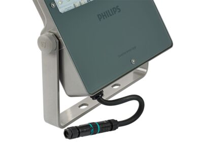 Floodlight, Hliník, Šedá, Hliníková šedá (RAL9007), Napájecí zdroj (zapnuto/vypnuto), 21000 lm, 141 W, 144 lm/W, 4000 K, (0.382, 0.379) SDCM 5, CRI70, Asymetrický, IP66 | Ochrana proti proniknutí prachu, ochrana proti tryskající vodě, IK08 | 5 J odolná proti vandalismu, Bezpečnostní třída I, Úroveň přepěťové ochrany do 6kV vdiferenciálním režimu a8kV vběžném režimu, Kabel 1,0m skonektorem kompatibilním s Wieland/Adels, třípólový, Externí konektor