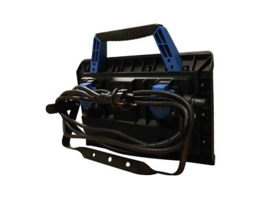 Reflektorové LED svítidlo Calipso, černé provedení s černo-modrým madlem, barva světla chladně bílá (6500 K), 45 W, 2 stupně výkonu: 4950 lm/2500 lm, životnost > 30 000 hodin. IP54, IK08. Reflektor je opatřen dvěma zásuvkami typu E a přívodním kabelem o délce 3 metry se síťovou zástrčkou.