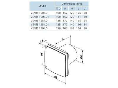 Domovní axiální ventilátor Vents LD je určen k odsávání vzduchu z menších bytových a nebytových prostor jako jsou koupelny, toalety, kuchyně, prodejny, kanceláře a podobně. Vzhledem ke svým technickým parametrům se doporučuje ventilátory používat v kombinaci s kratšími vzduchotechnickými potrubími s nižší tlakovou ztrátou, popřípadě k odsávání přímo přes stěnu. Základní model je vybaven motorem s kluzným uložením rotoru. V případě montáže do stropu nebo při využívání ventilátoru k dlouhodobému chodu se doporučuje použití ventilátoru vybaveného kuličkovými ložisky. Součástí ventilátoru není zpětná klapka. K tomuto ventilátoru je možno objednat zpětnou klapku „KO“.