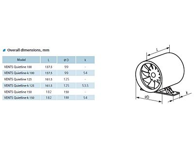 Domovní axiální ventilátor Vents QUIETLINE je určen k odsávání vzduchu z menších bytových prostor jako jsou koupelny, toalety, kuchyně a to díky své tichosti a úspornosti. Ventilátor se montuje přímo do potrubí. Vzhledem ke svým technickým parametrům se doporučuje ventilátory používat v kombinaci s kratším vzduchotechnickým potrubím. Ventilátory typové řady QUIETLINE jsou již v základu vybaveny kuličkovými ložisky, což umožňuje montáž v jakékoliv poloze nebo jejich využití k nepřetržitém dlouhodobém provozu. Všechny motory jsou vybaveny tepelnou pojistkou. Kryt a vrtule ventilátorů je vyrobena z vysoce kvalitního ABS plastu odolnému vůči UV záření. Tvar vrtule zajišťuje efektivnost a trvanlivost ventilátorů. Ventilátory mohou ovládat pomocí samostatného přepínače nebo mohou být zapojeny paralelně s osvětlením. Modely označené "T" jsou vybaveny časovým spínačem s nastavitelným doběhem v rozsahu od 2 do 30 minut. Ventilátory se montují do kulatého potrubí. Typy s označením "k" jsou vybaveny držákem na povrch.
