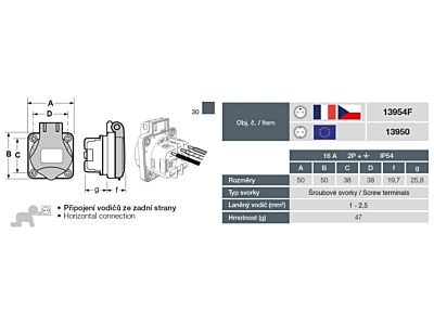 Zásuvka vestavná 13954F IP54/250V/16A s ochranným kolíkem, modrá. Rozměry: 62x50x43mm, rozteč otvorů pro šroubky 38x38mm. Přívod vodičů ze zadní části.