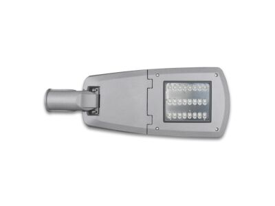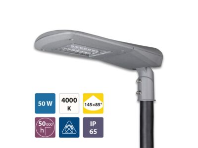 LED pouliční svítidlo 50W, šedá barva, 230V, IP65, 4000K-neutrální bílá, světelný tok 5750lm, vyzařovací úhel 145x85°, CRI>70, životnost až 50.000h, rozměry 591x256x131mm, materiál hliník+sklo, nestmívatelné, PF>0,9
