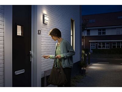 Venkovní nástěnné LED svítidlo Petronia s pohybovým senzorem má moderní čtvercový design a osvítí po zaznamenání pohybu příjemným teplým bílým světlem domovní vchod.