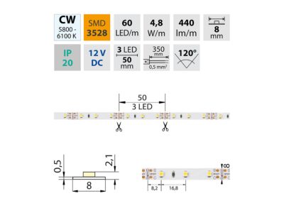 LED pásek SMD3528, studená bílá (6000K), 4,8W, 60LED, 440lm/m, segment 50mm, 3LED/segment, IP20, DC 12V, životnost 54000h, šíře 8mm, bílý PCB pásek, max. délka pásku při jednostranném zapojení: 5m, opatřen samolepící páskou 3M, UV stabilní.