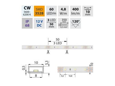 LED pásek SMD3528, studená bílá (6000K), 12W, 60LED, 396lm/m, segment 50mm, 3LED/segment, IP68, DC 12V, životnost 54000h, šíře 10mm, bílý PCB pásek, max. délka pásku při jednostranném zapojení: 5m, opatřen samolepící páskou 3M, UV stabilní.
