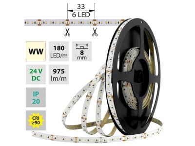LED pásek SMD2216, 2800-3100K (teple bílý WW), 12W, 180LED, 975lm/m, segment 33,3mm, 6LED/segment, IP20, DC 24V, životnost 54000h, šíře 8mm, bílý PCB pásek, max. délka pásku při jednostranném zapojení: 5m, opatřen samolepící páskou 3M, UV stabilní.
