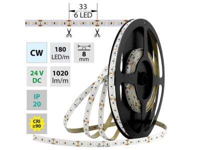 LED pásek SMD2216, studená bílá (6000K), 12W, 180LED, 1020lm/m, segment 33,3mm, 6LED/segment, IP20, DC 24V, životnost 54000h, šíře 8mm, bílý PCB pásek, max. délka pásku při jednostranném zapojení: 5m, opatřen samolepící páskou 3M, UV stabilní.