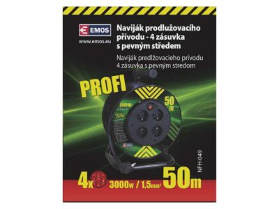 Naviják prodlužovacího přívodu s fixovaným středem. 4 zásuvky 230V~. Délka prodlužovacího přívodu 50m. Vodič PVC - H05VV-F3G 1,5mm2. Naviják má fixovaný střed což je obrovskou výhodou při manipulaci (rozmotávání/namotávání) s připojenými spotřebiči. Fixovaný střed – až o 75% lepší manipulace. Kvalitní naviják prodlužovacího přívodu. Je ideální pro prodloužení napájecí sítě 230V~. Jeho výhodou je pohodlná manipulace díky bubnu.