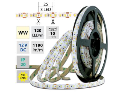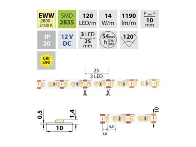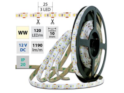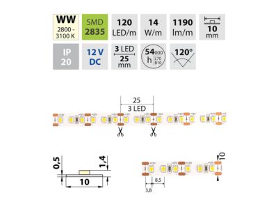 LED pásek SMD2835, 2800-3100K (teple bílý WW), 14W, 120LED, 1190lm/m, segment 25mm, 3LED/segment, IP20, DC 12V, životnost 54000h, šíře 10mm, bílý PCB pásek, max. délka pásku při jednostranném zapojení: 5m, opatřen samolepící páskou 3M, UV stabilní. Balení 5m.
