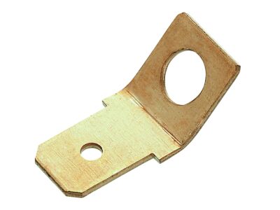 Konektor s lopatkou, neizolovaný. Technické údaje - Materiál: Mosaz, lesklá; úhlové provedení. Provedení: 1x45°; Rozměr zástrčky: 6,3x0,8; Pro šrouby o Ø M4 mm; Hmotnost na 100 kusů ~kg: 0,085; PU/jednotka: 100.