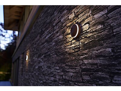 Zahradní nástěnné LED svítidlo s kruhovým designem, které svými paprsky vytváří příjemnou světelnou mlhu ve tvaru kruhu v jeho okolí.