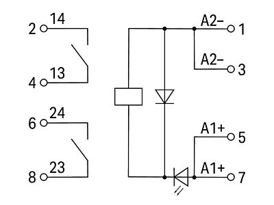 Reléový modul; Jmenovité vstupní napětí: 24 V DC; 2 spínací kontakt; Mezní trvalý proud 8 A; Drážní aplikace; Indikace stavu, zelená; Konstrukční šířka 20 mm