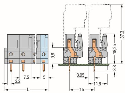 Pružinová svorkovnice THT; Rovné provedení; Rozteč 7,5 mm; 6pól.; Pájecí kontakt 0,6 × 1,0 mm; Šedá