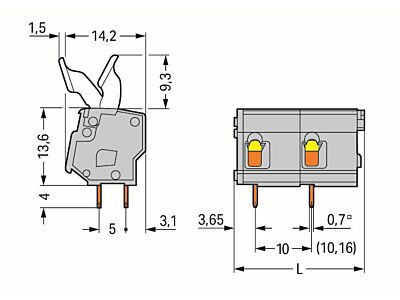 Svorka na desky plošných spojů; Ovládací tlačítko; 2,5 mm²; Rozteč 10/10,16 mm; 6pól.; CAGE CLAMP®; Možnost můstkového propojení; Šedá