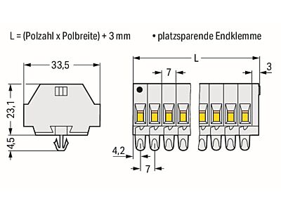 2vodičová svorkovnice; Bez tlačítka; Vhodná pro aplikace Ex e II; Se západkami; 7pól.; Pro plech o tloušťce 0,6–1,2 mm; Upevňovací otvor Ø 3,5 mm; 4 mm²; CAGE CLAMP®; 4,00 mm²; Světle šedá