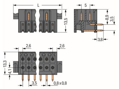 Konektor s pájecími piny THT, 2řadý; Pájecí kontakt 0,8 × 0,8 mm; Úhlové provedení; 100% ochrana proti chybnému zapojení; Rozpojovací pomůcka; Rozteč 3,5 mm; 32pól.; Černá