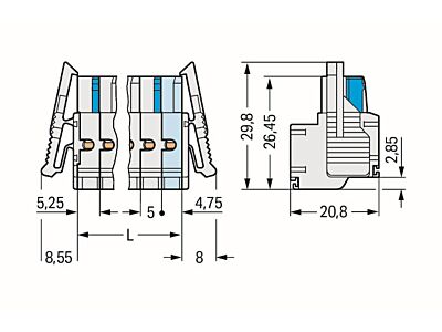 2vodičová pružinová svorkovnice; Push-in CAGE CLAMP®; 2,5 mm²; Rozteč 5 mm; 14pól.; 100% ochrana proti chybnému zapojení; Boční blokovací západky; 2,50 mm²; Světle šedá
