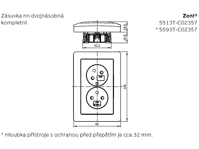 ABB ZONI Zásuvka 5513T-C02157 137 16A, dvojnásobná s clonkami, natočenou dutinou, IP40, matná černá/bílá