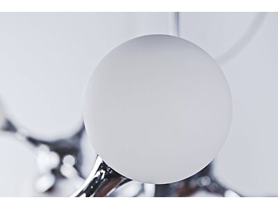 Lampa s chromovaným ramenem a stínítky ve formě bílých skleněných kuliček.