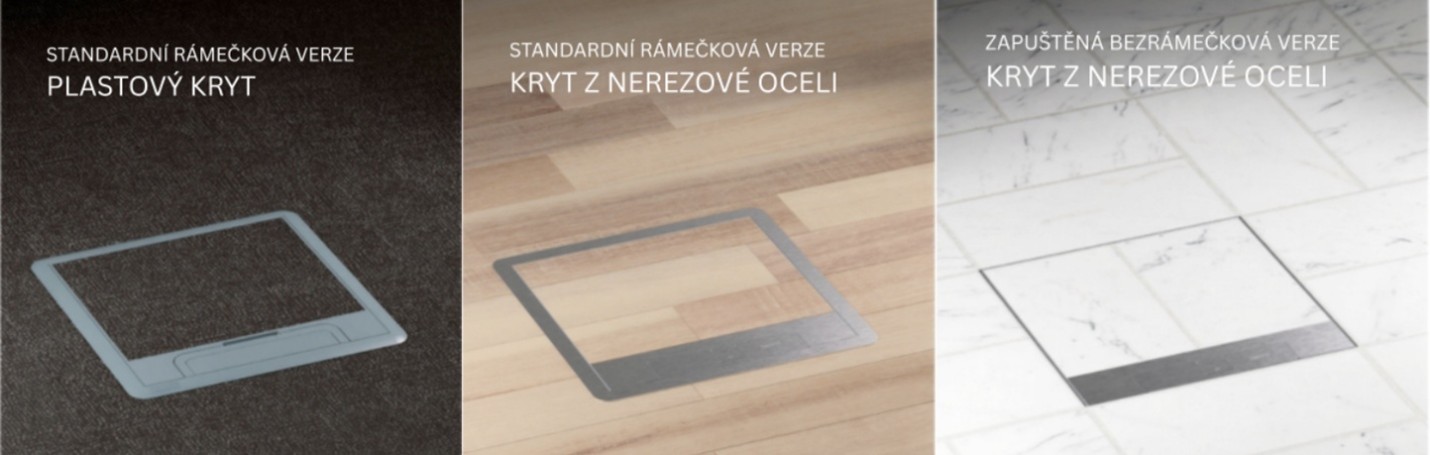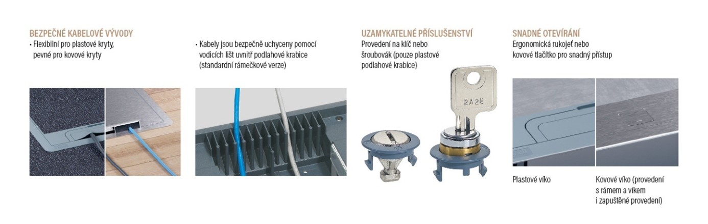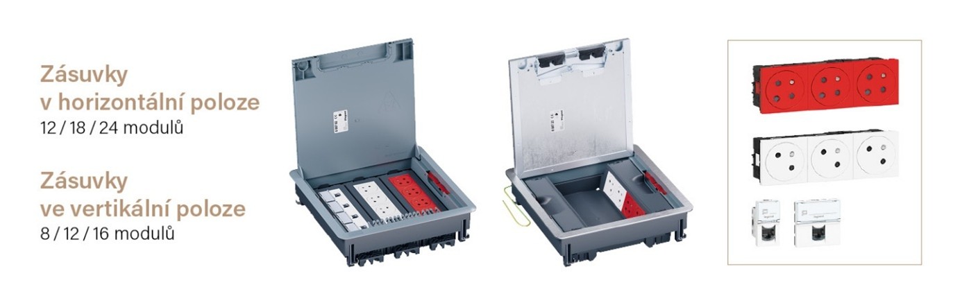 Na výběr jsou tři velikosti podlahových krabic, každá nabízí dvě orientace montáže zásuvek. Volba závisí na požadovaném počtu zásuvek, způsobu použití a dostupné hloubce podlahy. K dispozici je také verze bez rámečků pro přístroje - tzv. protahovací krabice. Všechny podlahové krabice jsou kompatibilní se standardními mechanismy o rozměru 45 mm, například z řady Mosaic™. To umožňuje kompletní přizpůsobení potřebám (zásuvky, datové zásuvky RJ45, HDMI, USB nabíječky atd.)