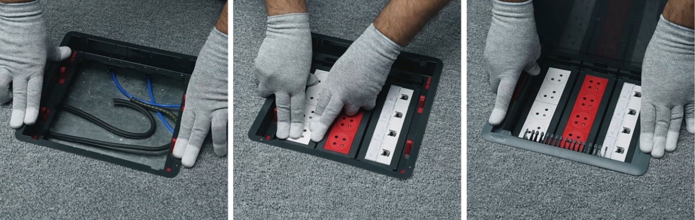 Intuitivní montážní systém, který nevyžaduje žádné speciální nářadí, pro rychlou instalaci na místě. Instalace zacvaknutím, s nastavitelnými vaničkami a odnímatelnými montážními rámečky pro snadnější zapojení. Jedno katalogové číslo odpovídá jedné podlahové krabici připravené k instalaci (přístrojová jednotka včetně krytu).