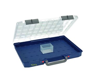 Box na sortiment CIMCO se sendvičovým víkem zaujme svým důmyslným systémem. Vkládací přihrádka umožňuje bezpečně a přehledně uložit až pět listů dokumentů nebo obsah. Mřížkový systém ve víku a dně zabraňuje sklouznutí obsahu.