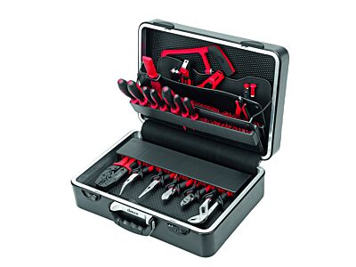 Perfektní kufr na nářadí "Elektro". Elegantní, pevný a robustní kufr z tvrdé skořepiny se 3 deskami na nářadí = 4 vkládacími lištami a přihrádkou na dokumenty. Základní přihrádka s mřížkovým dělením a přepážkami pro bezpečné uložení měřicích přístrojů a drobných dílů, CLOU, nové desky na nářadí se senzačním upínacím efektem, malé i velké nářadí lze vložit bez povinného organizačního principu a bezpečně drží na místě, i když je kufr při přepravě vzhůru nohama. Kompletní výbava s 21 nástroji. Obsah kufříku s nářadím 1x po jednom kusu: Telefonní kleště s ochrannou izolací 1 000 V, rovné čelisti 200 mm, DIN ISO 5745 (10 0216), Telefonní kleště s ochrannou izolací 1 000 V, zahnuté čelisti, 200 mm, DIN ISO 5745 (10 0238), Diagonální štípací kleště 160 mm s 1.000 V ochrannou izolací, 160 mm, DIN ISO 5749B (10 0574), odizolovací kleště JOKARI Super 4 (10 0760), boční štípací kleště na elektroniku do ø 1,3 mm, 21°, 132 mm (10 1040), kleště na vodní čerpadla DIN ISO 8976 s úchopovými objímkami 250 mm (10 1224)krimpovací kleště systém click n crimp, (10 6000), sada klíčů se šestihrannou hlavou, 7dílná, SW 2,5-10, skládací ruční držák (11 0596),zkoušečka fází 120 250 V AC, 3,0/65 mm (11 1280)přesný šroubovák s drážkou, barevný kód bílý, 2,0x0,4x60 mm (11 1864), 1.000 V Šroubovák s drážkou 185 mm, DIN EN 60900, 3,0x0,5 mm (11 7702)1 000 V Šroubovák s drážkou 185 mm, DIN EN 60900, 4,0x0,8 mm (11 7704), 1 000 V Šroubovák s drážkou 220 mm, DIN EN 60900, 5,5x1,0 mm (11 7705), 1.000 V Křížový šroubovák PH 1, 80 mm, DIN 7438, (11 7731), 1 000 V Křížový šroubovák PH 2, 100 mm, DIN 7438 (1 7732), 1 000 V Křížový šroubovák PZ 1, 80 mm (11 7741), 1.000 V křížový šroubovák PZ 2, 100 mm (11 7742), kabelové nůžky DUOCUT, 160 mm s dvoustupňovým rozsahem střihu (12 0108)Kapesní pilka PROFI, rozpětí 150 mm (12 0490), 1.000 V bezpečnostní kabelový nůž, rovná silná čepel, 50 mm (12 1042),JOKARI kabelový nůž, 8 28 mm ø (12 2016) Hmotnost: 7 765 g, vnější rozměry Š/D/H: 485/355/180 mm, vnitřní rozměry Š/D/H1/H2/H#: 455/305/100/65/165 mm.