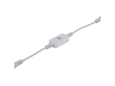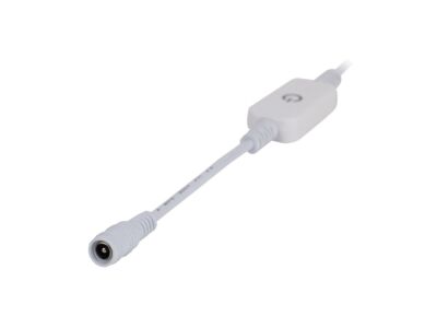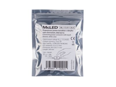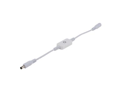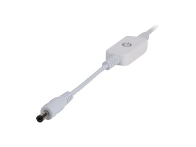 Dotykový stmívač s DC power konektory, bílá barva. Napájecí napětí: 12/24V, max. proud: 6A. Rozměry: 11x21x305mm, IP20. Krátký stisk: zapne/vypne, dlouhý stisk: stmívání v rozsahu cca 10%-100%. Po vypnutí tlačítkem si pamatuje poslední hodnotu, po výpadku napájení si nepamatuje. Výchozí stav po připojení napájení: problikne a zhasne. Při použití vlastního zdroje dejte pozor na jeho polaritu - viz obrázek!
