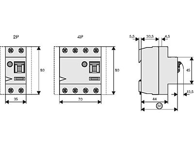 FI-Spínače PF6, 2-pólové, Jmenovitý pracovní proud In: 40 A, Jmenovitá odolnost proti zkratu Icn: 6 kA, Jmenovitý reziduální proud IΔN: 0,03 A, Typ A, citlivý na střídavý i pulzující stejnosměrný reziduální proud, podmíněná odolnost proti rázovému proudu 250 A, Spínací přístroje pro bytovou výstavbu a účelové stavby