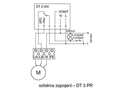 zapojení DT 3 PR – přepínač trvalého a zvýšeného (nárazového) větrání u ventilátorů, které mají motor s dvojím / trojím vinutím (např. EBB / TD 3V)