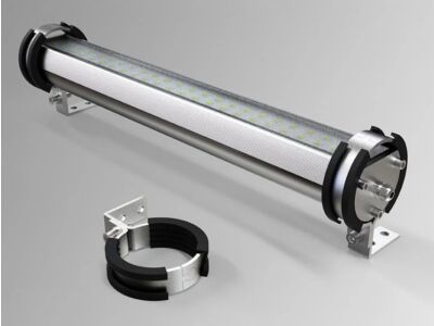 Strojní svítidlo lineární s upevňovacími sponami, snadná náhrada podobných svítidel, krytí IP 67, ochranné sklo, provedení LED, délky 442 mm - 1200 mm, vhodné k většině strojů pro plošné nebo lineární svícení, dále vhodné do dílenských prostor s prašným nebo jinak agresivním prostředím, provedení 24 V.
