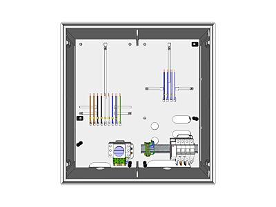 Elektroměrový rozvaděč pro jeden dvousazbový třífázový elektroměr pro odběry s instalovanou výrobnou elektřiny (FVE, KOG, MVE...) o výkonu do 100 kW, pro hlavní jističe do 63 A a s vypínačem instalace. Rozvaděč je vydrátován silovými vodiči CY 10 mm2. Rozváděč je určený pro měření s instalovanou výrobnou nebo záložním zdrojem.