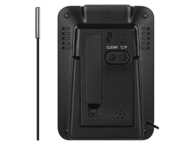 Drátový teploměr se zobrazením venkovní teploty a vnitřní teploty a vlhkosti. Teploměr má drátovou sondu v délce 2,9 m.